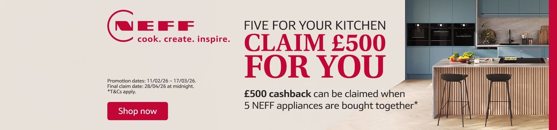 Neff £500 casback offer. Limited time. T & C apply. See instore for details